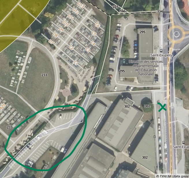 Où se garer? Le parking de la DSDEN n’est pas ouvert aux personnes extérieures, mais vous pourrez trouver place en face du collège (zone marquée d’une croix) ou bien sur le parking dit « cimetière haut » accessible via la rue Victor Lorain (zone cerclée de vert)
